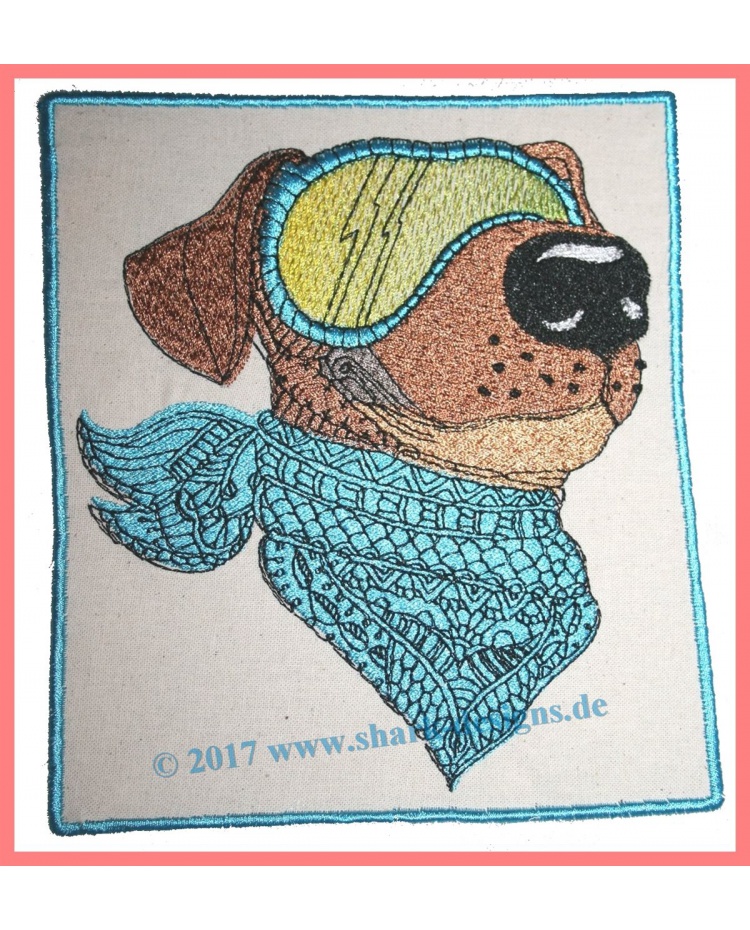 Er kommt in mehreren Rahmengrößen zu Ihnen, auch in ganz klein, und passt somit auch auf Gürteltaschen, wie man deutlich an dem zweiten Bild sehen kann, dort ist er in der Größe 10x10 gestickt.