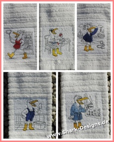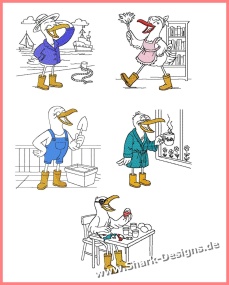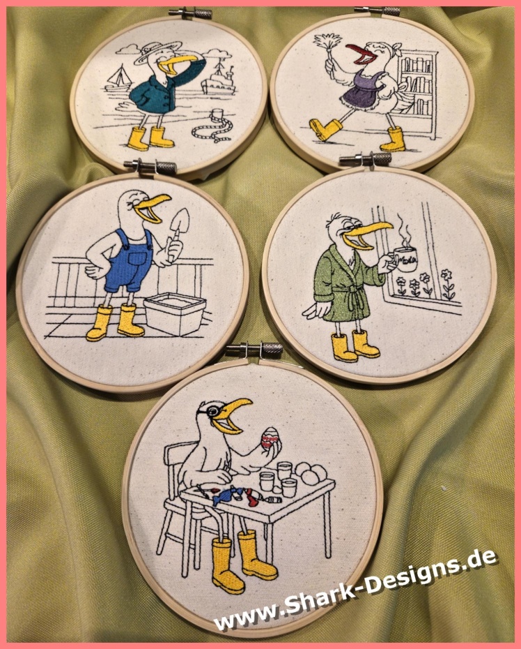Es sind 5 lustige Möwen in jeweils 6 Größen ab 10x10, die mit und ohne Unterlage für flauschige Stoffe enthalten sind. Einzeln gibt es die Möwenbande nicht, sie möchten gern zusammenbleiben.