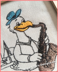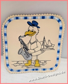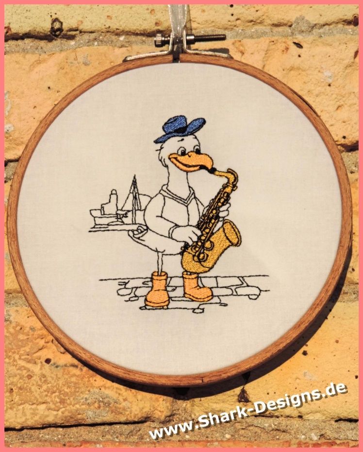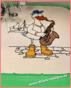 A fun seagull musician embroidery design with a nautical flair. Perfect for creating your own seagull band – ideal for creative embroidery projects.