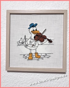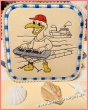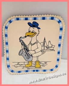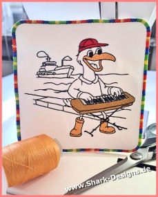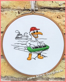 A fun seagull musician embroidery design with a nautical flair. Perfect for creating your own seagull band – ideal for creative embroidery projects.